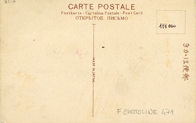 L'immagine mostra un gruppo di sei geisha in posa sul noryo yuka di un ristorante di Kyoto. Sullo sfondo si vede il fiume Kamo e lo Shijo Ohashi, il famoso ponte tappa finale, o di partenza, dell'antica Strada Tokaido (vedi cartolina "View of Mt. Fuji from Yshiwara"). I noryo yuka erano delle piattaforme di legno che venivano costruite sulle sponde e sopra il fiume Kamo, collegate col retro di alcuni ristoranti di Kyoto, e che venivano innalzate, e lo sono ancora oggi, ogni estate, tra il 1° maggio e il 30 settembre, per offrire agli ospiti sollievo alla calura grazie alla fresca brezza proveniente dal fiume. L'uso dei noryo yuka è molto antico, risale agli inizi del Periodo Edo (1603-1867). La donna col kimono chiaro sta versando il sake mentre le due donne sulla destra stanno giocando a Jan-ken-pon (morra cinese o "carta-forbici-pietra"). Sul pavimento coperto da stuoie sono appoggiate due lampade Andon./pNel 1896 questa immagine, col titolo Summer Evening on the Shijo River, apparve in uno dei libri fotografici Illustrations of Japanese Life di Ogawa Kazumasa: non tutte le immagini erano opera sua e nella prefazione egli ringrazia i fotografi Tamamura Kozaburo, Kajima Seibei, e il professore W. K. Burton per alcune delle illustrazioni (http://www.baxleystamps.com/litho/ogawa/ijl_no4.shtml). Nel 1910 un'immagine molto simile, effettuata nello stesso luogo e col titolo A Summer Evening, compare in Japanese Views and Characters, opera in tre volumi di Tamamura Kozaburo (http://www.baxleystamps.com/litho/tama/view1.shtml). Tamamura aveva fondato nel 1883 uno studio a Yokohama diventato già alla fine del secolo un vero impero della fotografia, agli inizi del Novecento vi lavorava come fotografo il figlio Kihei, che poi diventerà, tra il 1910 e il 1930, uno dei principali rappresentanti del pittorialismo giapponese. L'Università di Nagasaki attribuisce proprio a Tamamura Kihei l'immagine della cartolina (http://oldphoto.lb.nagasaki-u.ac.jp/unive/target.php?id=520). Ma Terry Bennet, il grande esperto di fotografia giapponese, nel 2006 ha ritrovato un articolo apparso nel settembre 1896 sulla rivista "The Practical Photography", dove la paternità della fotografia viene rivendicata senza alcun dubbio allo studioso e fotografo dilettante Y. Isawa, di cui peraltro non si conosce né il nome completo né i caratteri kanji del nome. Recentemente il collezionista Kjeld Duits ha trovato un'altra fotografia ascrivibile a Isawa e che chiaramente è stata eseguita nello stesso momento, nello stesso luogo e con due delle geisha che appaiono nella nostra immagine (http://www.meijishowa.com/photography/2772/110607-0011-geisha). Sebbene la fotografia sia stata eseguita prima del 1896, la cartolina è stata prodotta dopo il 1918, data in cui in Giappone si diffonde il tipo col verso diviso a metà e non più a un terzo.