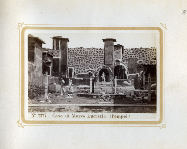 Scorcio del giardino sopraelevato della Casa di Marco Lucrezio a Pompei, adorno di statue ed erme marmoree. Al centro una fontana con nicchia. Sullo sfondo frammenti di dipinti murali