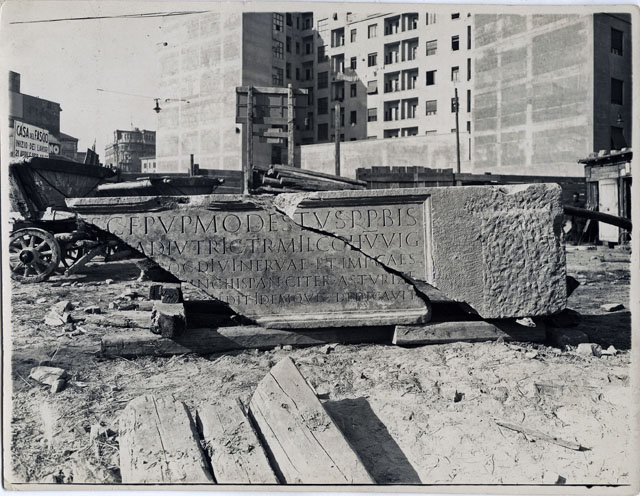 La lapide frammentaria di Quinto Petronio Modesto rinvenuta durante lo scavo del teatro romano di Trieste. La lapide è parzialmente ricomposta da due frammenti contigui che permettono di leggere l'iscrizione:/p[Q(uintus) Pe]tro[ni]us C(ai) f(ilius) Pup(inia) Modestus, p(rimus) p(ilus) bis/p[leg(ionis) XII Ful]m(inatae) e[t leg(ionis)] I Adiutric(is), tr(ibunus) mil(itum) coh(ortis) V vig(ilum),/p[tr(ibunus) coh(ortis) XII urb(anae), tr(ibunus) coh(ortis) V pr(aetoriae), p]roc(urator) Divi Nervae et Imp(eratoris) Caes(aris)/ [Nervae Traiani Aug(usti) Germ(anici) pro]vinc(iae) Hispan(iae) Citer(ioris) Asturiae/ [et Callaeciarum, flamen] Divi Cla[udi, d]edit idemque dedicavit. La lapide, rinvenuta in tre copie che si differenziano lievemente per impaginazione e dimensioni e che riproducono lo stesso testo, ricorda probabilmente una ristrutturazione del teatro avvenuta tra il 98 e il 102 d.C. ad opera del primopilo (ufficiale) di legione Quinto Petrolio Modesto.