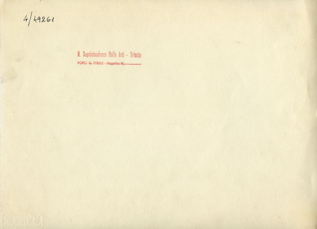 Il teatro romano di Trieste in fase di scavo. La foto è stata scattata durante l'ultimo periodo di scavo, in prossimità dell'inaugurazione del monumento avvenuta il 21 aprile del 1938. Il teatro è infatti quasi interamente alla luce, la cavea e l'orchestra sono visibili, si sta invece completando la rimozione dell'interro in corrispondenza dell'iposcenio, dove si nota ancora la presenza di uno spesso riporto.