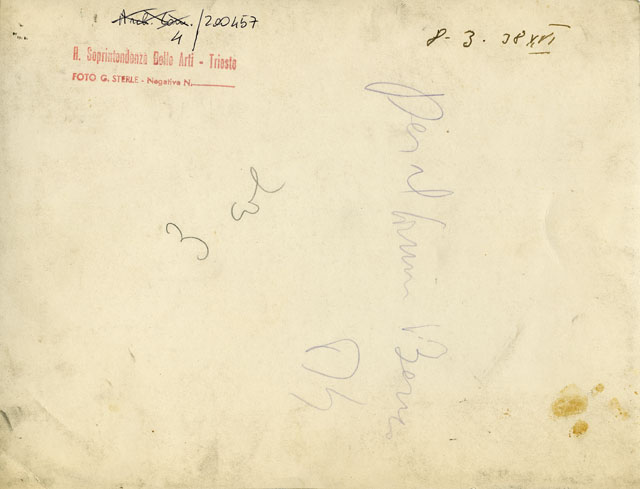 Veduta dello scavo del teatro romano nella zona di Donota in Cittavecchia ripresa dall'estremità sud-occidentale della cavea. La foto, scattata l'8 marzo del 1938, permette di constatare lo stato di avanzamento dei lavori che si concluderanno di lì a poco, il 21 aprile successivo, data dell'inaugurazione del monumento e della sua apertura al grande pubblico. Al momento dello scatto lo scavo ha messo in luce il muro perimetrale della cavea, la gradinata fino all'orchestra e sta proseguendo in corrispondenza della zona dell'orchestra e del frontescena, in corrispondenza del quale iniziano ad emergere i primi resti del muro di fondo.