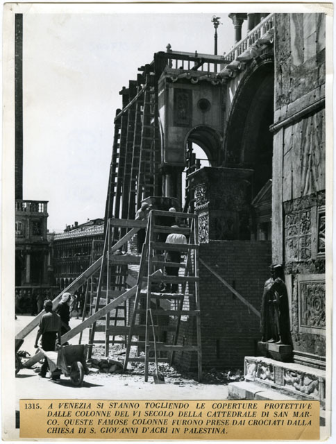 A VENEZIA SI STANNO TOGLIENDO LE COPERTURE PROTETTIVE DALLE COLONNE DEL VI SECOLO DELLA CATTEDRALE DI SAN MARCO. QUESTE FAMOSE COLONNE FURONO PRESE DAI CROCIATI DALLA CHIESA DI S. GIOVANNI D'ACRI IN PALESTINA.