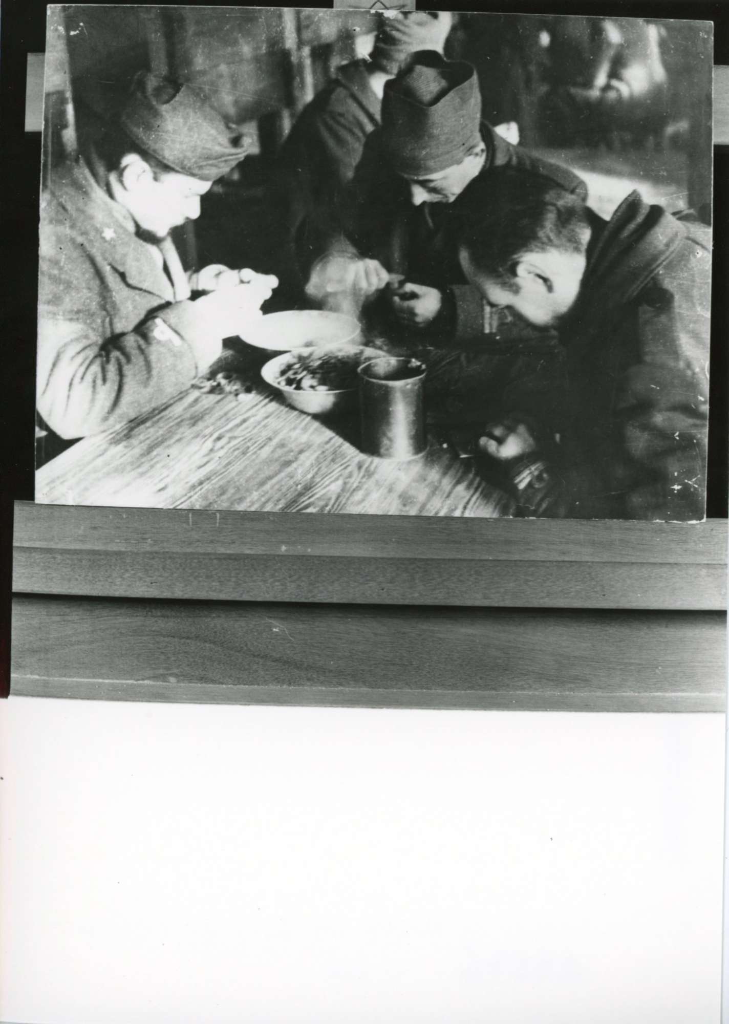 Gruppo di soldati che mangiano in una baracca