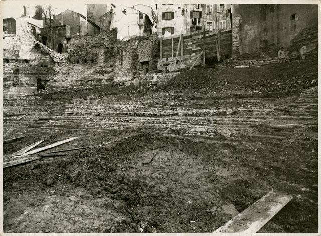 Scavo del teatro romano in Cittavecchia, tra le aree di Riborgo e Donota. La foto inquadra la porzione meridionale della cavea, di cui sono stati messi in luce il muro perimetrale e la parte più alta della gradinata dalla "summa cavea" fino ai primi gradini dell'"ima cavea", oltre la "praecinctio", ossia il corridoio semianulare che divide i due settori della gradinata. I gradini ripresi nella foto si collocano tra il terzo e il quarto "scalaria" partendo da est. Come si apprende dalla relazione mandata da l'ispettore che dirigeva le operazioni di recupero, il dott. B. Molajoli, a Rudolf Horn per la rivista Archäologischen Anzeiger del 1938, i gradini "erano in laterizi rivestiti di lastre di pietra". Nella foto sono ridotti per lo più al nucleo di opera incerta sul quale erano appoggiate le lastre lapidee.