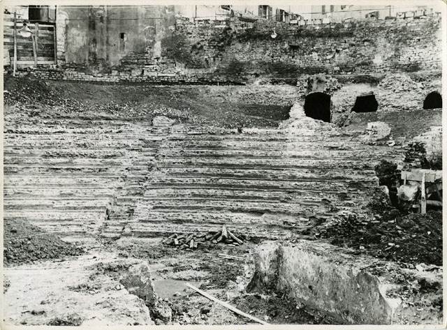 Scavo del teatro romano in Cittavecchia, tra le aree di Riborgo e Donota. La foto inquadra l'estremità occidentale della cavea, di cui sono stati messi in luce il muro perimetrale, la "summa cavea", il "vomitorium", la "praecinctio" e gran parte dell'"ima cavea". Il tratto di gradinata ripreso nella foto si colloca tra il quarto e il quinto "scalaria" partendo da est. In primo piano, nell'area dell'orchestra, vi sono alcuni resti degli edifici moderni che verranno demoliti per portare in luce le strutture antiche.
