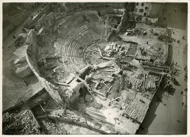 Il teatro romano in corso di scavo. La foto documenta il procedere del cantiere: si vede che è stata portata alla luce la cavea con le gradinate fino all'orchestra mentre la zona occupata dalla scena è in fase di scavo.