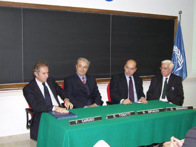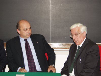 Il sindaco Roberto Dipiazza con direttore ad interim del Centro di fisica Erio Tosatti e l'ambasciatore italiano all'Unesco di Parigi Francesco Caruso.