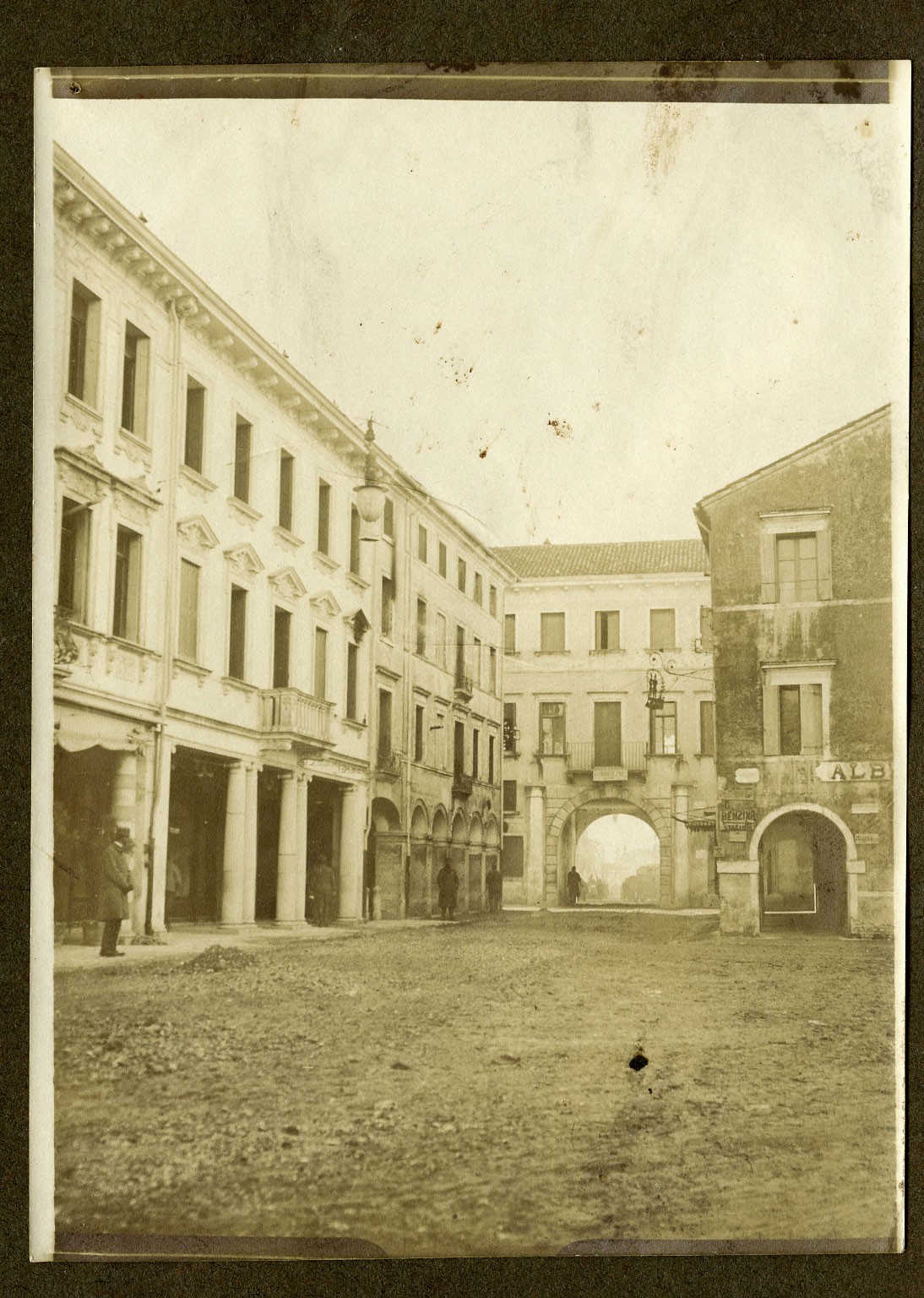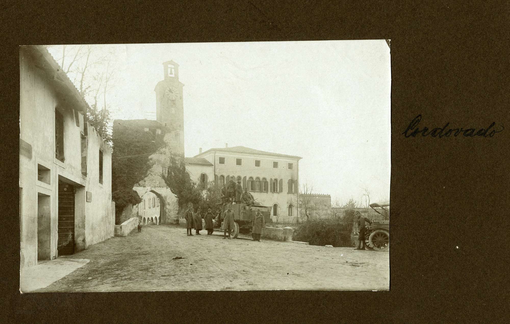 Gruppo di soldati con un camion all'ingresso di Cordovado Piazzale