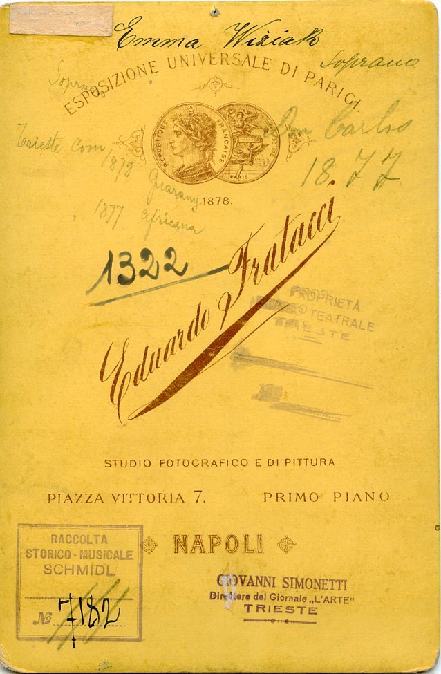 Ha cantato a Triete al Teatro Comunale nel 1872 in "Guarany", "Gli ugonotti", "Gustavo Wasa" e "Ione"e nel concerto del 7.12.1872; nel 1876 in "Don Carlos" e nel 1877 in "L' africana" e "La contessa di Amalfi"