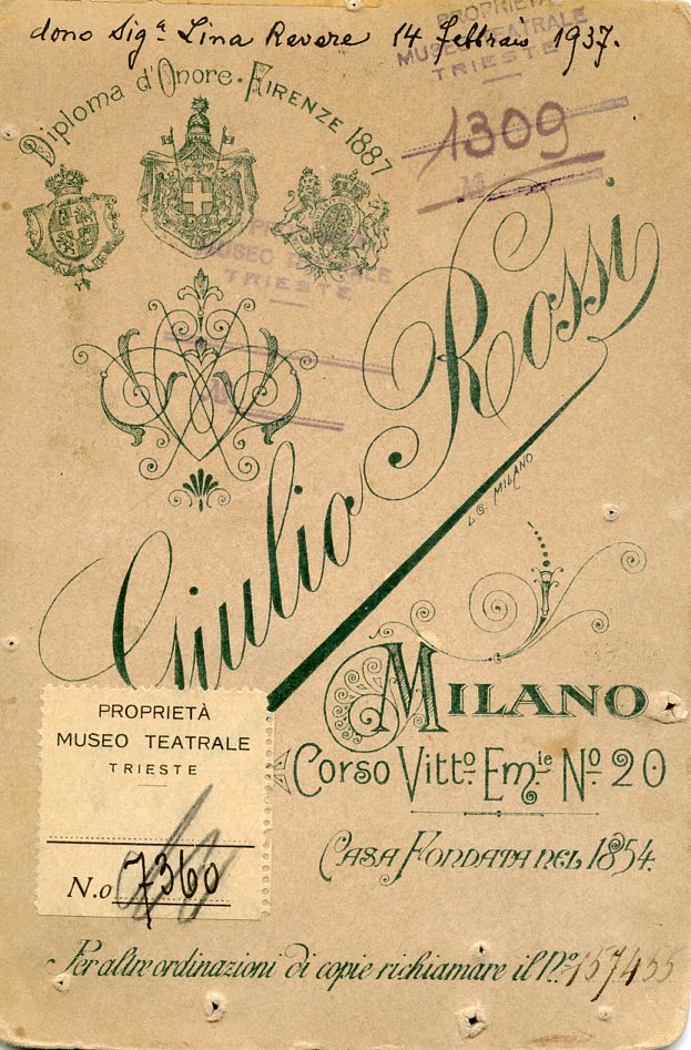 In costume di scena, probabilmente nel ruolo di Maddalena nell'"Andrea Chenier". A Trieste ha cantato al teatro Verdi nel 1899 in "Andrea Chenier", "Boheme", "Saffo"e "La resurrezione di Lazzaro"; nel 1914 in"Don Pasquale"e "Traviata"; nel 1920 in "Lodoletta"; al Politeama Rossetti nel 1900 in "Mignon"; al teatro Fenice nel 1894 in "I pagliacci" e nel 1896 in "Mignon" e "La pupilla"