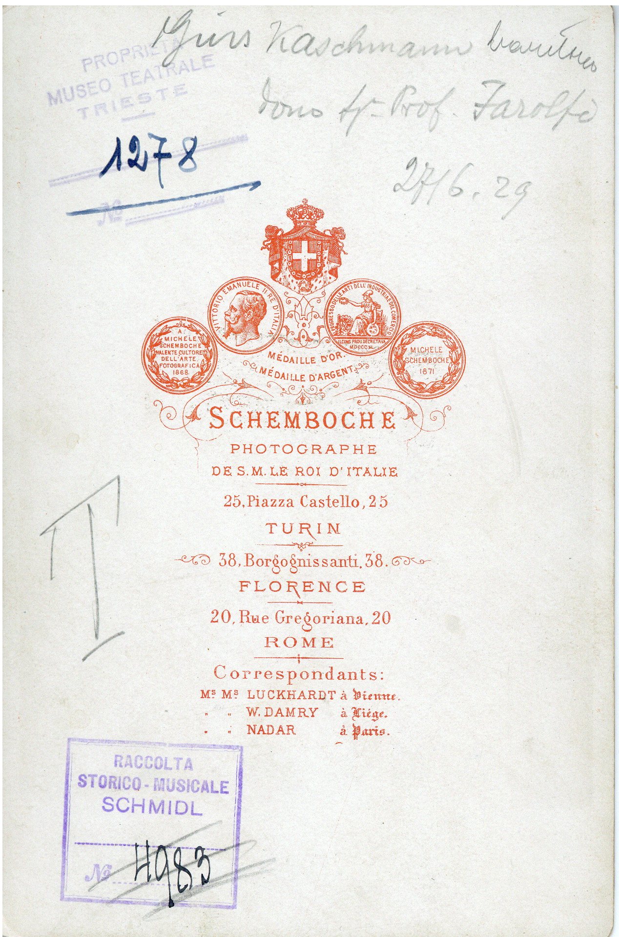 Proprietà Ente pubblico territoriale; Civico museo teatrale C. Schmidl; donazione; Farolfi; 1929/06/27