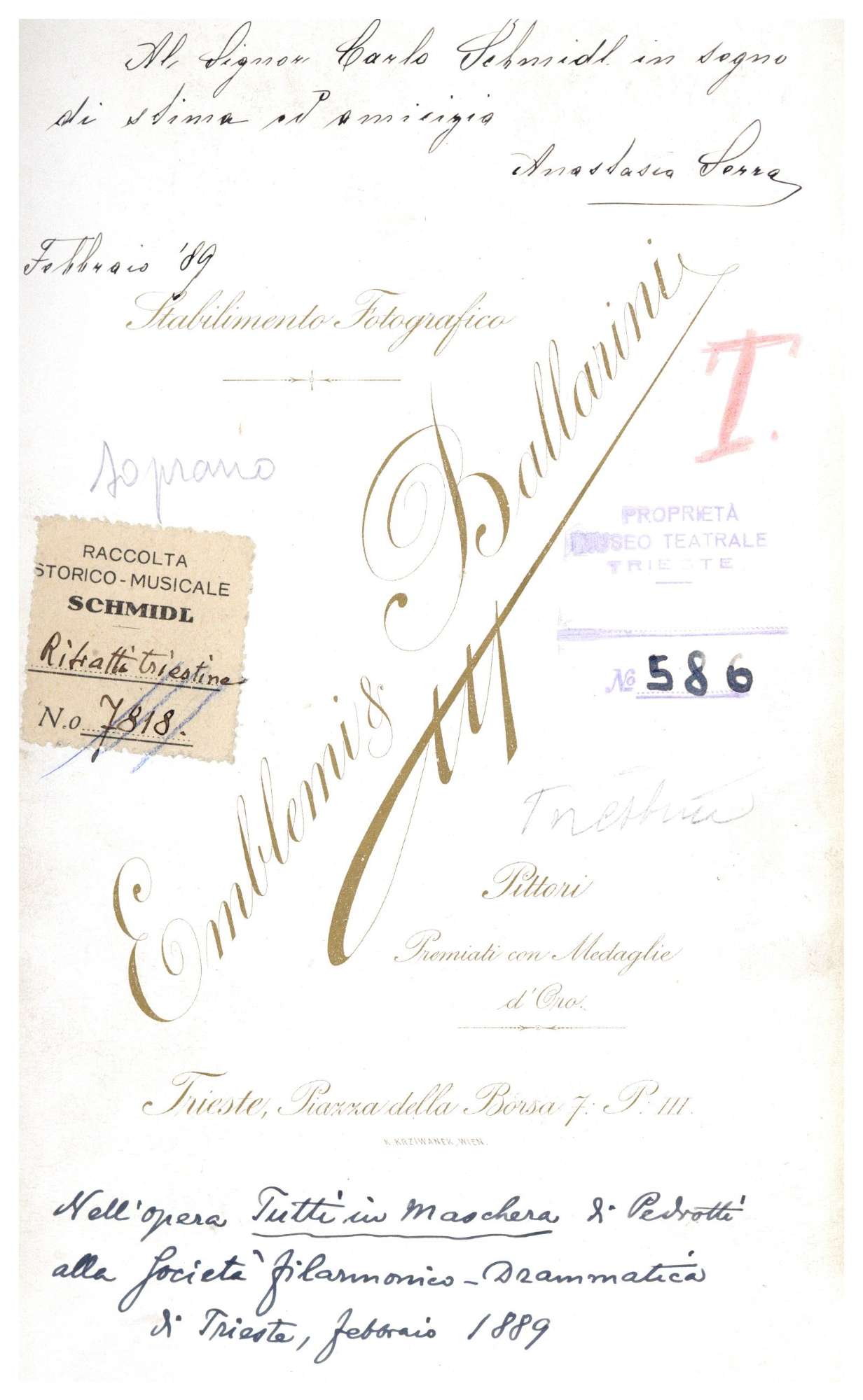 In costume per l'opera "Tutti in maschera". Sorella di Demetrio e Gaetano Serra (baritoni), allieva del m° Friedrich, debuttò come soprano dilettante nell'opera "Tutti in maschera" di Pedrotti nel 1888 all Societa Filarmonico Drammatica.Fu anche poetessa e traduttrice con lo pseudonimo di Nelia Fabretto; ha sposato Carlo Schmidl di cui fu valida collaboratrice.
