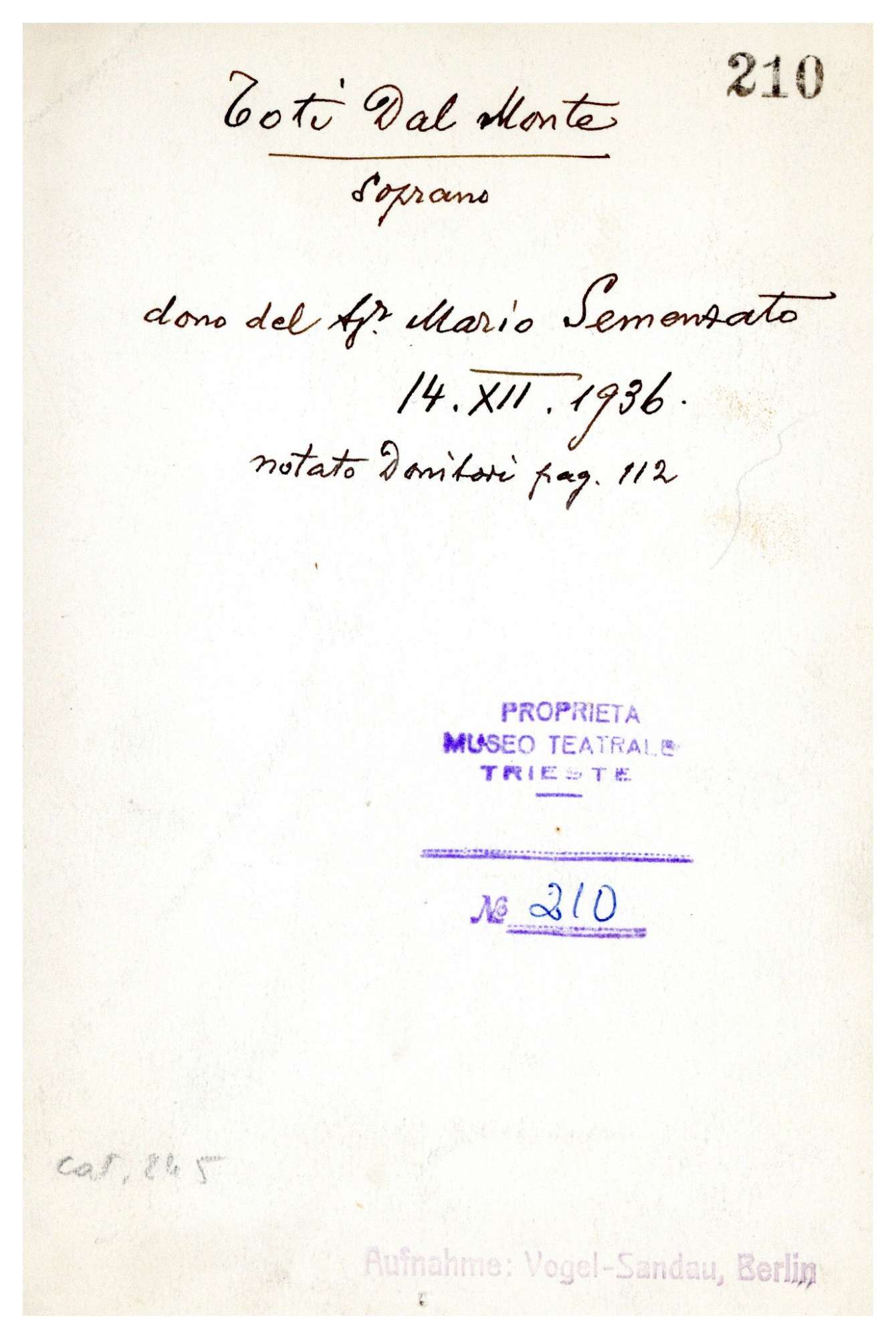 Proprietà Ente pubblico territoriale; Civico museo teatrale C. Schmidl; donazione; Semenzato, Mario; 1936/12/14