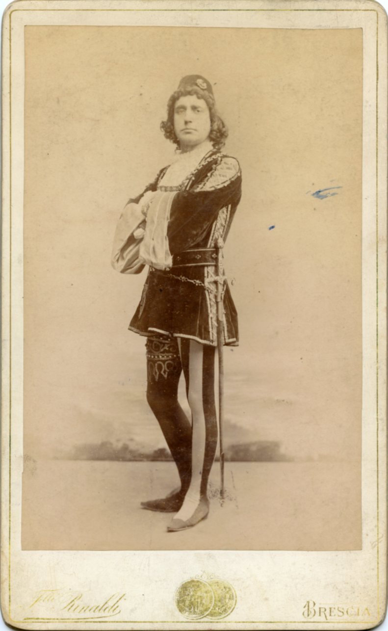 In costume nel ruolo di Jago in "Otello". Cantò al Politeama Rossetti di Trieste in concerto di beneficenza il 12.12.1888 , e il 15.11.1901 in concerto con la violinista Teresina Tua. Nel 1889 a Parma nella "Carmen" e alla Scala di Milano in "Simon Boccanegra"; nel 1893 al Teatro Grande di Brescia in "Otello", nel 1895 in "Ruy Blas" e "Ernani" al Teatro Cressoni di Como