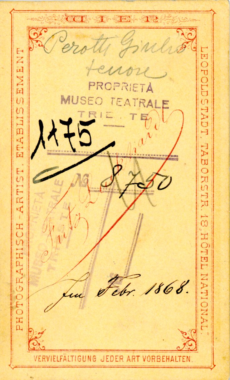 In costume. Alias Julius Prott, tenore, si è esibito in molte città d'Europa e d'America. Nel 1874 ha cantato al teatro Mauroner di Trieste nel "Trovatore". Appassionato di giardinaggio, alla fine della sua carriera si è stabilito a Trieste dove ha aperto un'azienda per la coltura delle rose riconosciuta a livello internazionale; si può anche ricordare lo storico negozio di fiori in Capo di Piazza.