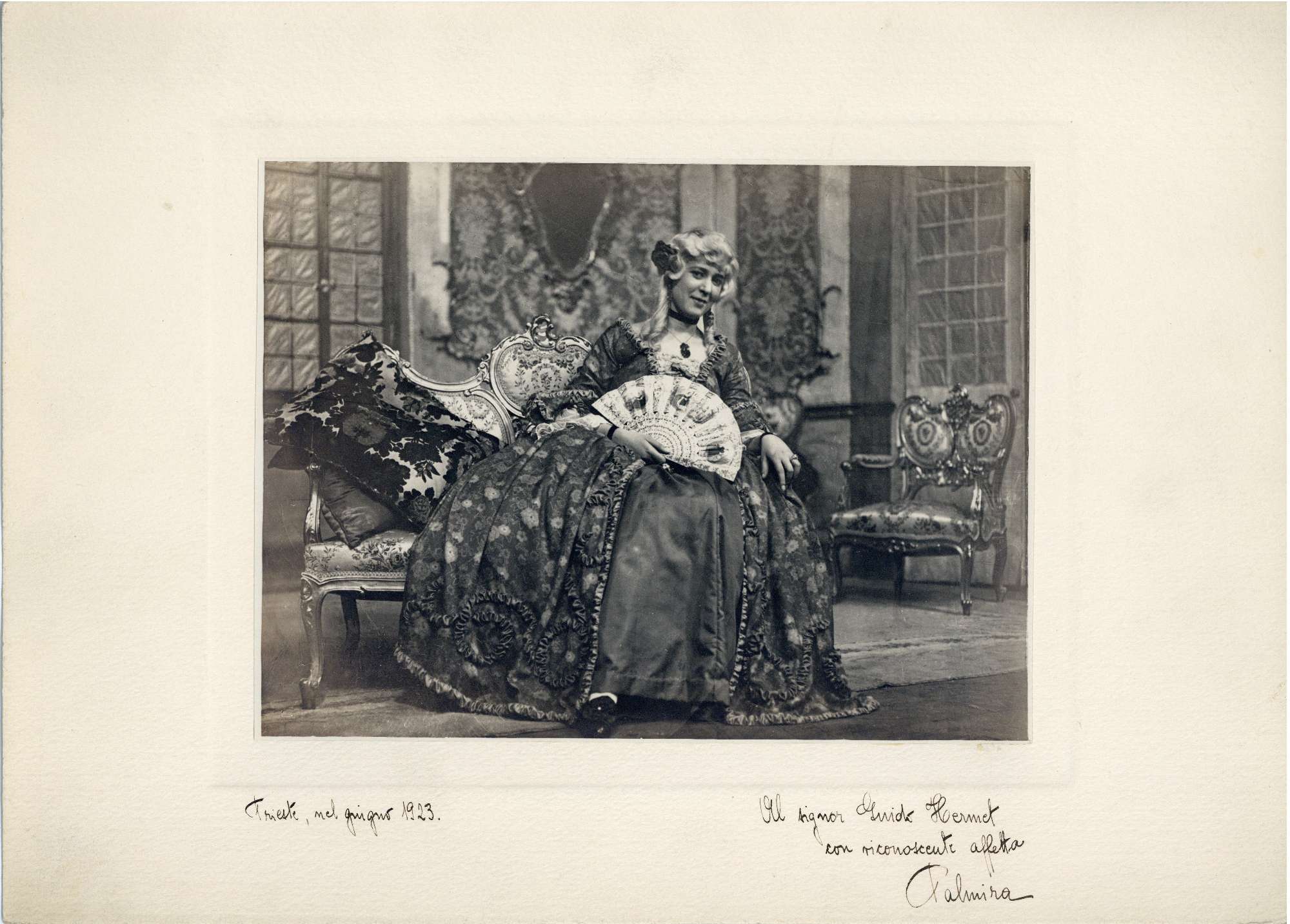 D. Mussun nel ruolo di Siora Silvestra (vecchia sorella di sior Luca) nella commedia Le Morbinose di Carlo Goldoni al Circolo Artistico di Trieste, dal 4 al 6 aprile 1923