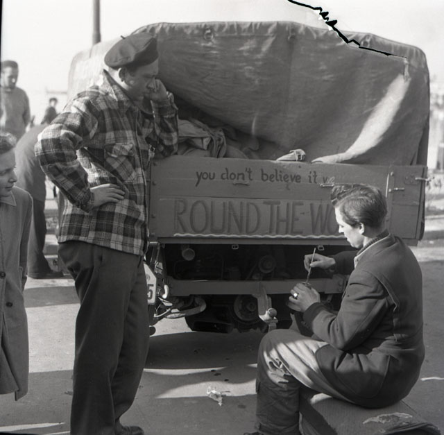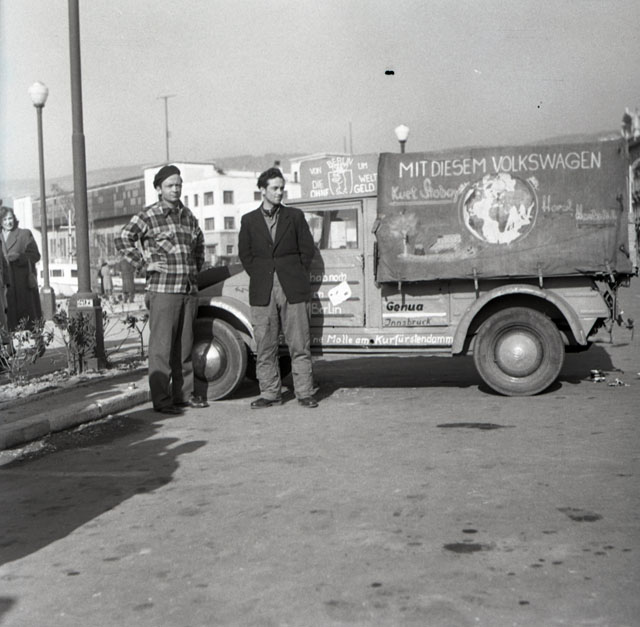 Due giovani tedeschi, Kurth Stoboj di 30 anni e Horst Hentschel, entrambi della zona americana di Berlino, contano di compiere il giro del mondo senza soldi in due anni, a bordo di una autovettura non nuovissima ma efficiente. Sono partiti da Berlino il 20 gennaio (da: Giornale di Trieste, 16 febbraio 1954)