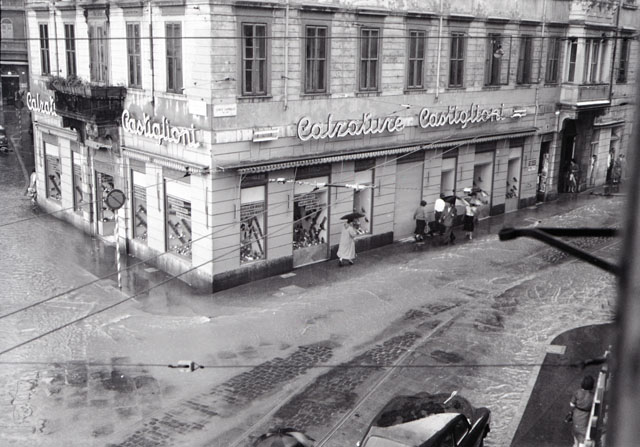 Le strade allagate e in primo piano chiaramente distinguibili le vetrine e le insegne del negozio di calzature Castiglioni e i negozi Fiori Valdemarin, Covelli e Montanari oreficeria. Due motocicli in strada sotto la pioggia scrosciante