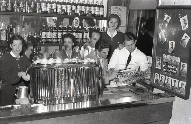 Sul bancone si nota la macchina del caffè mentre sulla mensola sono presenti le bottiglie di Bianco Sarti