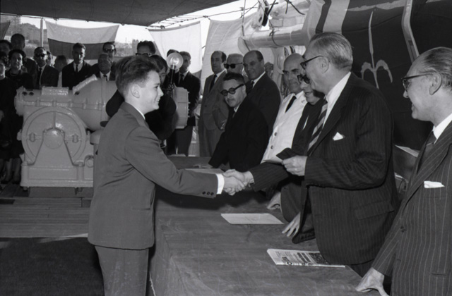 A bordo della motonave Europa, il presidente del Lloyd Triestino, amm. Capponi, consegna le borse di studio assegnate dalla Società.