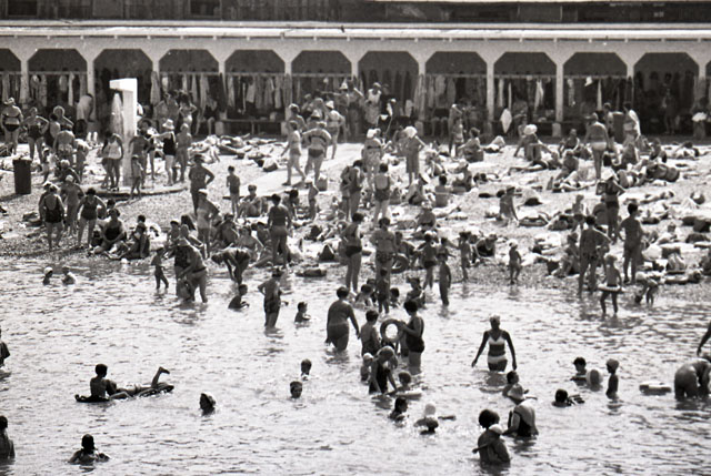 Anni 1960/'70 Bagnanti Lanterna e Ausonia e barca Gabbiano pulisce mare
