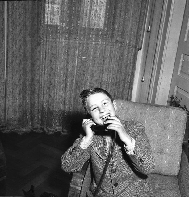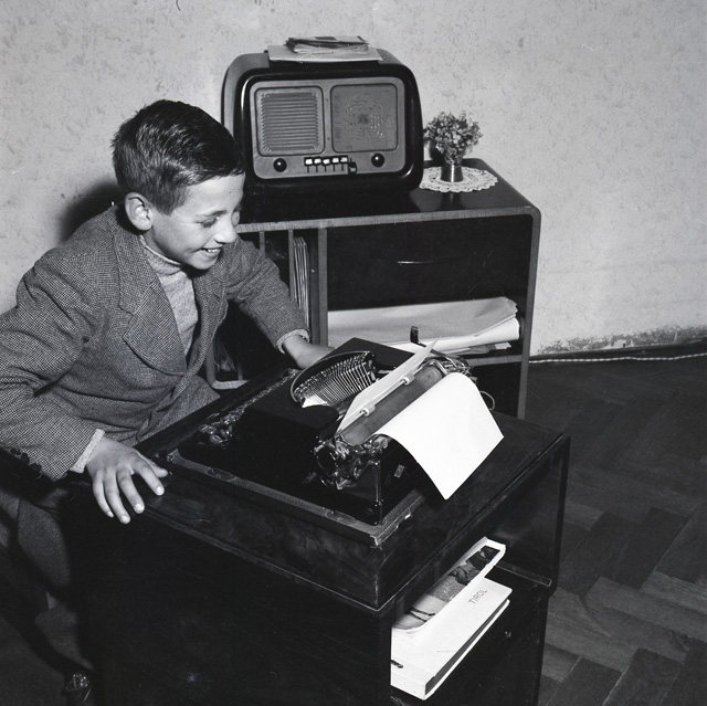 Fanciullo che telefona, fotografa, scrive a macchina e ascolta la radio