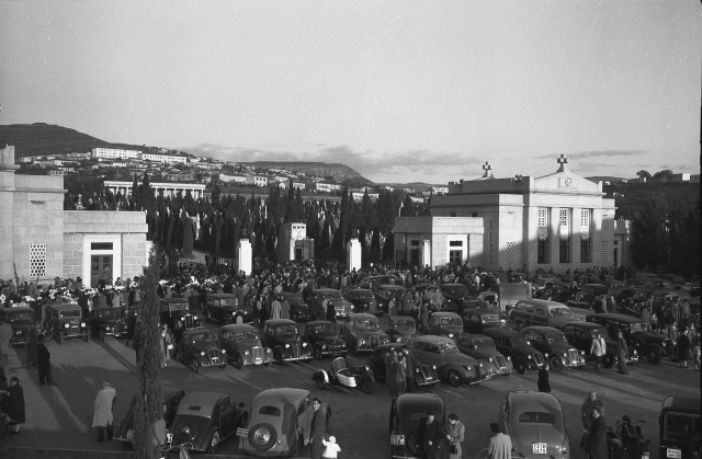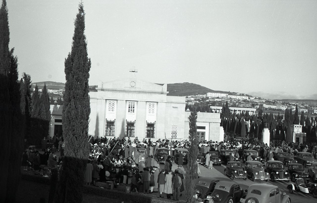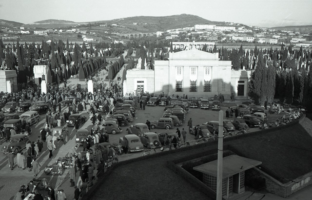 Tradizionale visita al cimitero di Sant'Anna il 2 novembre 1952, giorno della commemorazione dei defunti. Riprese del cimitero dall'alto