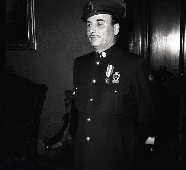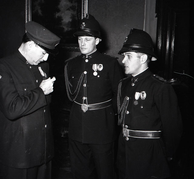 Umberto Rossano, agente della Polizia Amministrativa, riceve dal consigliere comunale Ezio Bernardoni, la medaglia di bronzo al valor civile, conferita dal presidente della Repubblica su proposta del ministero dell'Interno, per aver salvato una donna caduta in mare l'11 settembre 1953.