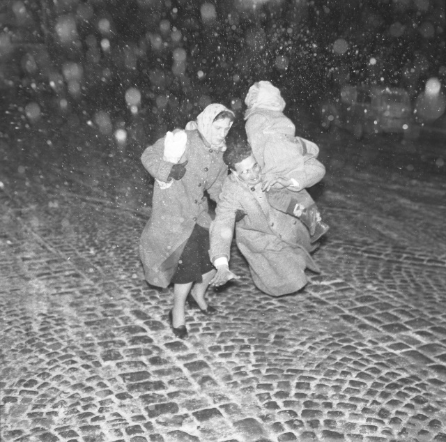 Tra gennaio e febbraio imperversa il maltempo in citta', con bora, gelo e qualche abbondante nevicata. Vedute di piazza Unita' d'Italia, delle Rive, del molo Audace, di viale XX Settembre, di via Fortunio, del Colle di San Giusto, dal quale scendono improvvisati sciatori. Alcune violentissime raffiche di bora provocano quattro vittime, crolli e danni in via Conti, in via Molino a Vento, alla piscina comunale Bruno Bianchi, alla fabbrica di birra Dreher e in altre zone della città. 147 famiglie si ritrovano prive di alloggio.