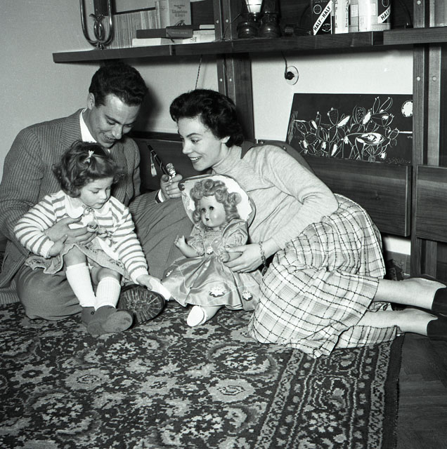 Bambina immortalata mentre stira e gioca con i genitori