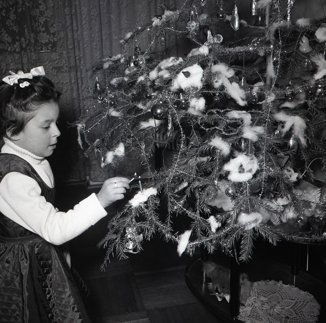 Ritratto di bambina accanto all'albero di Natale