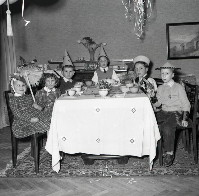 Bambino festeggia il suo settimo compleanno con gli amici, durante il Carnevale