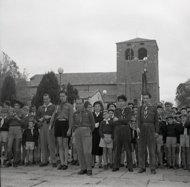 Una rappresentanza della sezione di Vicenza dei Giovani Esploratori Italiani restituisce alla Sezione di Trieste in una cerimonia sul colle di San Giusto, un tricolore ricevuto in consegna nel 1946. Testo tratto da Il Piccolo, 31.10.1954, p. 2