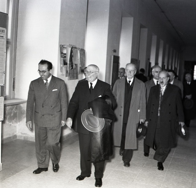 Una delegazione di 18 dei 150 studenti che nel 1904 si batterono a Innsbruck per chiedere l'istituzione a Trieste dell'Università italiana sono stati ricevuti dal Sindaco dopo aver deposto una corona d'alloro sulla lapida di Via Filzi ed essere stati accolti dal rettore dell'Università, Rodolfo Ambrosino. Testo tratto dal Piccolo sera, 16.11.1954.