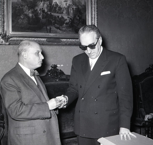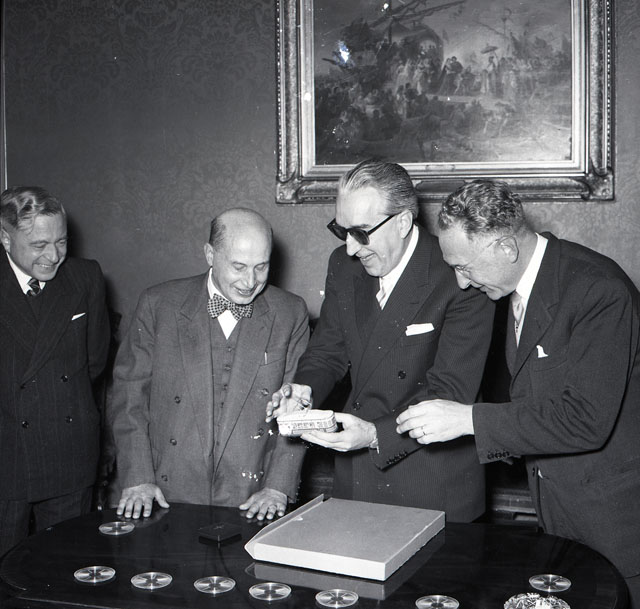 Il direttore generale di Acegat, GIuseppe Lorenzetti, si congeda dal sindaco e presenta il nuovo direttore generale, De Mottoni. Lorenzetti dona a Bartoli un modellino del tram. Testo tratto da Il Piccolo, 12.11.1954