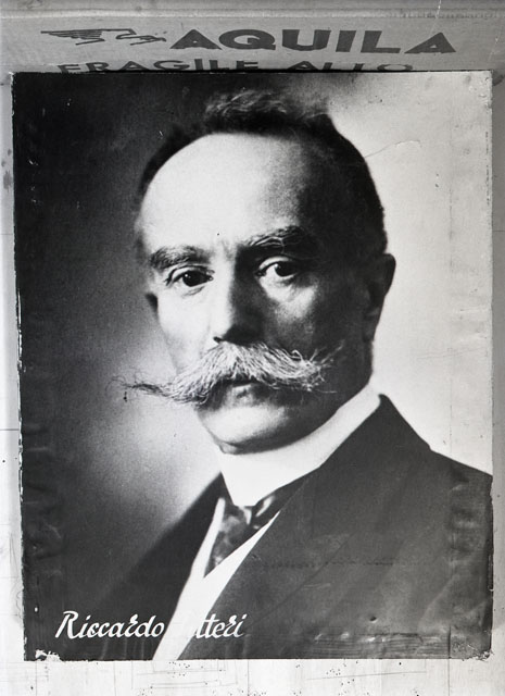 Riproduzione di fotografia di Riccardo Pitteri (Trieste 1853 - Roma 1915), presidente della sezione Adriatica della Lega nazionale dal 1901 fino al 1914, e presidente della Lega nazionale dal 1900 al 1902, nel 1904, e dal 1908 al 1910. Sul supporto sottostante la scritta Aquila