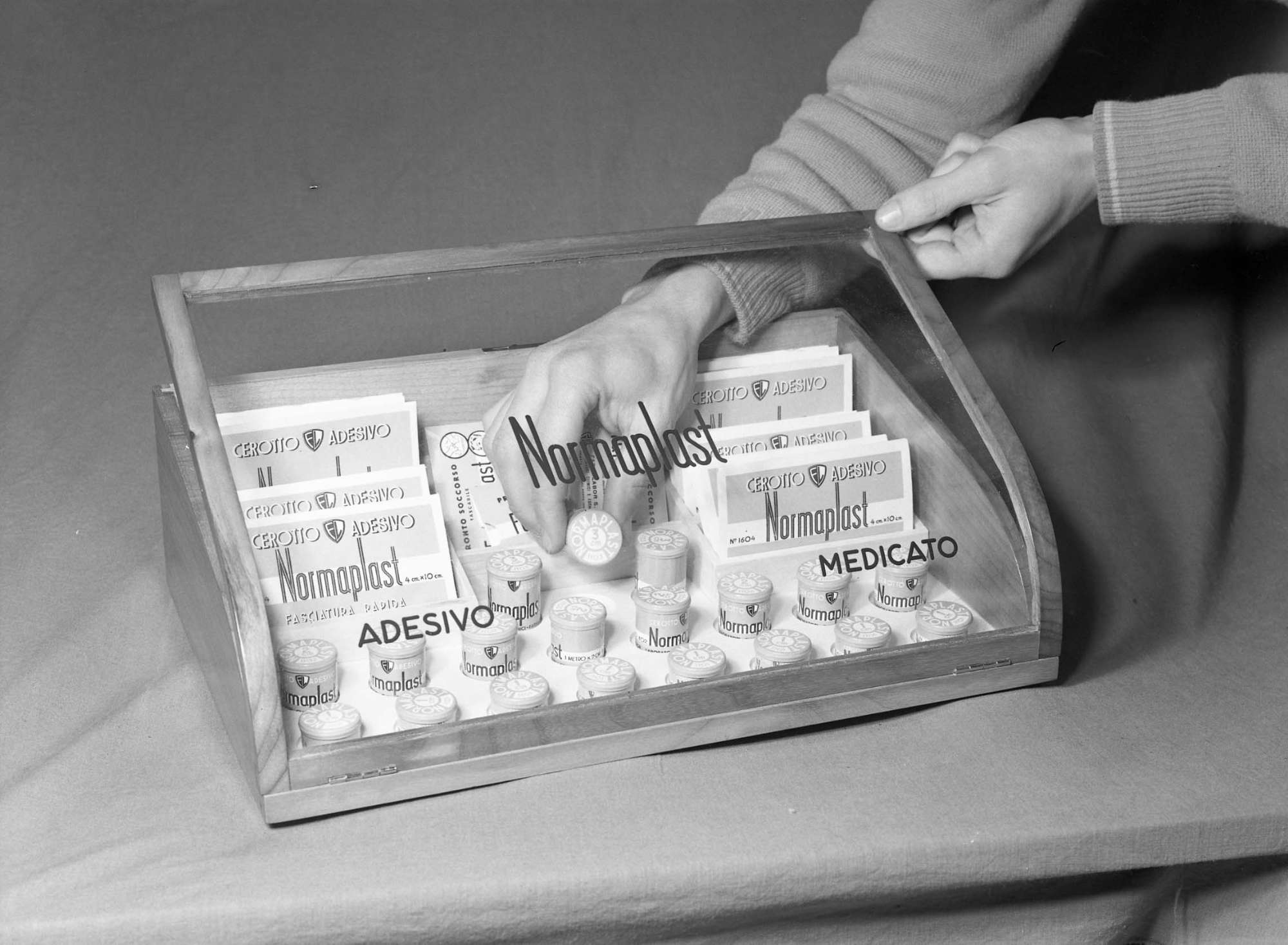 Riproduzione di un espositore con cerotti adesivi medicati Normaplast