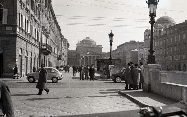 Domenica 13 marzo 1955 ha luogo in piena citta' la parata delle nuove utilitarie lanciate sul mercato dalla Fiat. Una quarantina di "600" percorre il festoso carosello delle vie cittadine raggiungendo il piazzale di San Giusto e ripercorrendo quindi le vie del centro e le Rive. E' la prima uscita ufficiale alla conquista di un vasto pubblico della nuova macchina