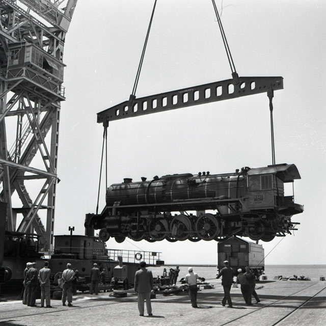 Dal Molo quarto la gru pontone Ursus carica tre locomotive austriache sulla nave Ambra del Lloyd triestino, in partenza per l'India.
