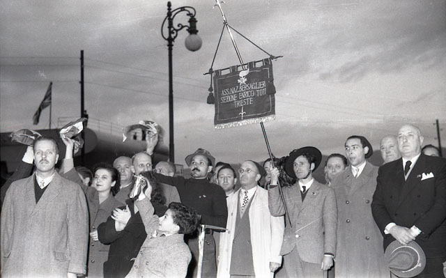 Deposizione di corone della Associazione Nazionale Bersaglieri, sezione Enrico Toti di Trieste, sotto la targa che ricorda lo sbarco, dall'incrociatore Audace, dei bersaglieri a Trieste il 3 novembre 1918