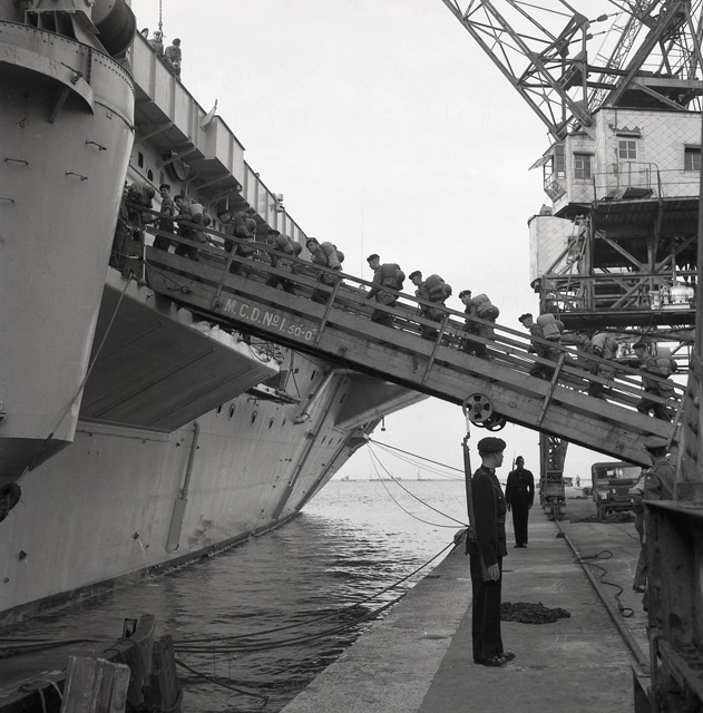 Alla vigilia dell'arrivo dei soldati italiani le ultime truppe britanniche si imbarcano, unitamente ai loro mezzi, su una portaerei, ormeggiata poco distante dall'idroscalo (da: Ugo Borsatti, Trieste 1954, fotografie dell'Archivio Storico "Foto Omnia" di Ugo Borsatti di proprieta' della Fondazione CRTrieste, Trieste, Lint, 2004, p. 66-67).