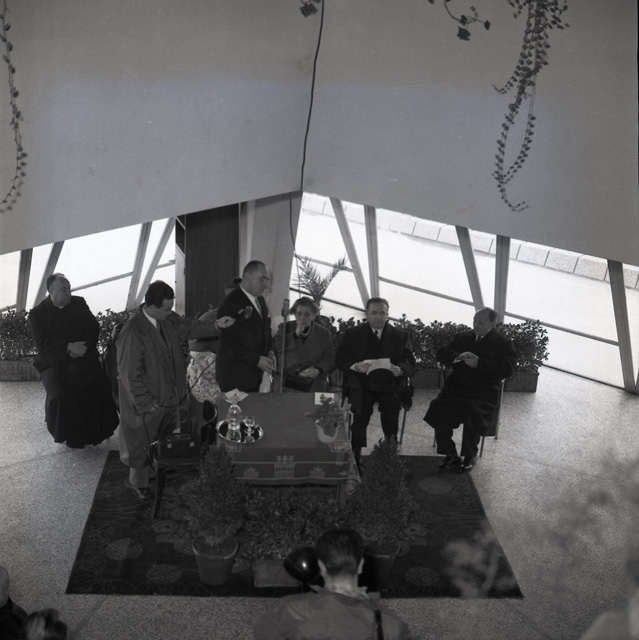 Inaugurato al Villaggio del Fanciullo il nuovo laboratorio di falegnameria; il taglio del nastro viene eseguito dalla figlia dello statista Vittorio Emanuele Orlando che tanto teneva allo sviluppo di questa istituzione. Tra le autorità è presente l'onorevole Giuseppe Pella. Notizie tratte da Il Piccolo 10.12.1955