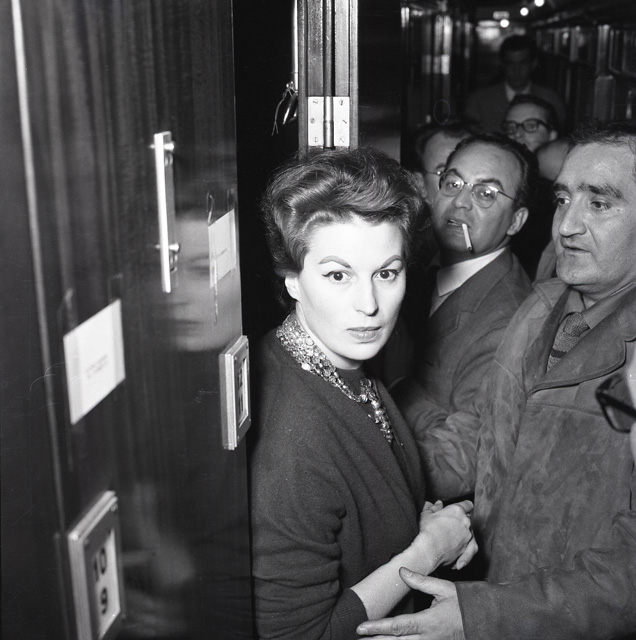 Ugo Borsatti corre in stazione a mezzanotte per immortalare Silvana Mangano (Roma, 1930-Madrid, 1989) nella carrozza letto del treno diretto a Belgrado. L’attrice deve concludere le riprese del film "La tempesta", ed è accompagnata dal marito Dino De Laurentiis (Torre Annunziata, 1919-Beverly Hills, 2010), dal regista Alberto Lattuada (Vapro d’Adda, 1914-Roma, 2005), dalle triestine Fulvia Franco (Trieste, 1931-Roma, 1988) e Anna Gruber (Trieste, 1929-2000). Il fotografo resta molto colpito dall’affabilità, dal modo di parlare della diva e dal suo profilo.