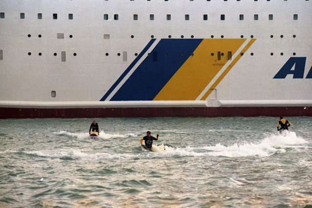 Gatiblers, motociclisti. Damiani, Drossi Fortuna, Rosato in salotto. Azzurro 1999. Rive di Trieste, stand bavisela, moto d'acqua. Marino Sterle, Andrea Tele4. Stazione marittima, molo con navi, conferenza sulla pace stazione marittima. Sottosegretario Toia.