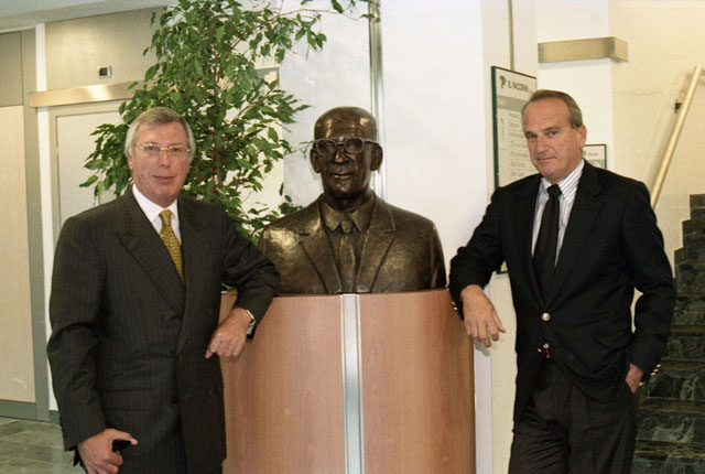 Pacorini inaugurazione nuova sede famiglia Pacorini al completo, fratelli Pacorini con scultura Carà.