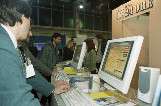 Computer. Provincia-Giuliani nel mondo. Dario Rinaldi. Fiera di Trieste: convegno, fiera economia (02/02/01), computer, padiglioni fiera, interni fiera.