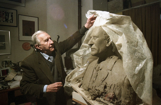 Pacorini inaugurazione nuova sede, famiglia, Ugo Carà scultore al lavoro, scultura Pacorini padre.