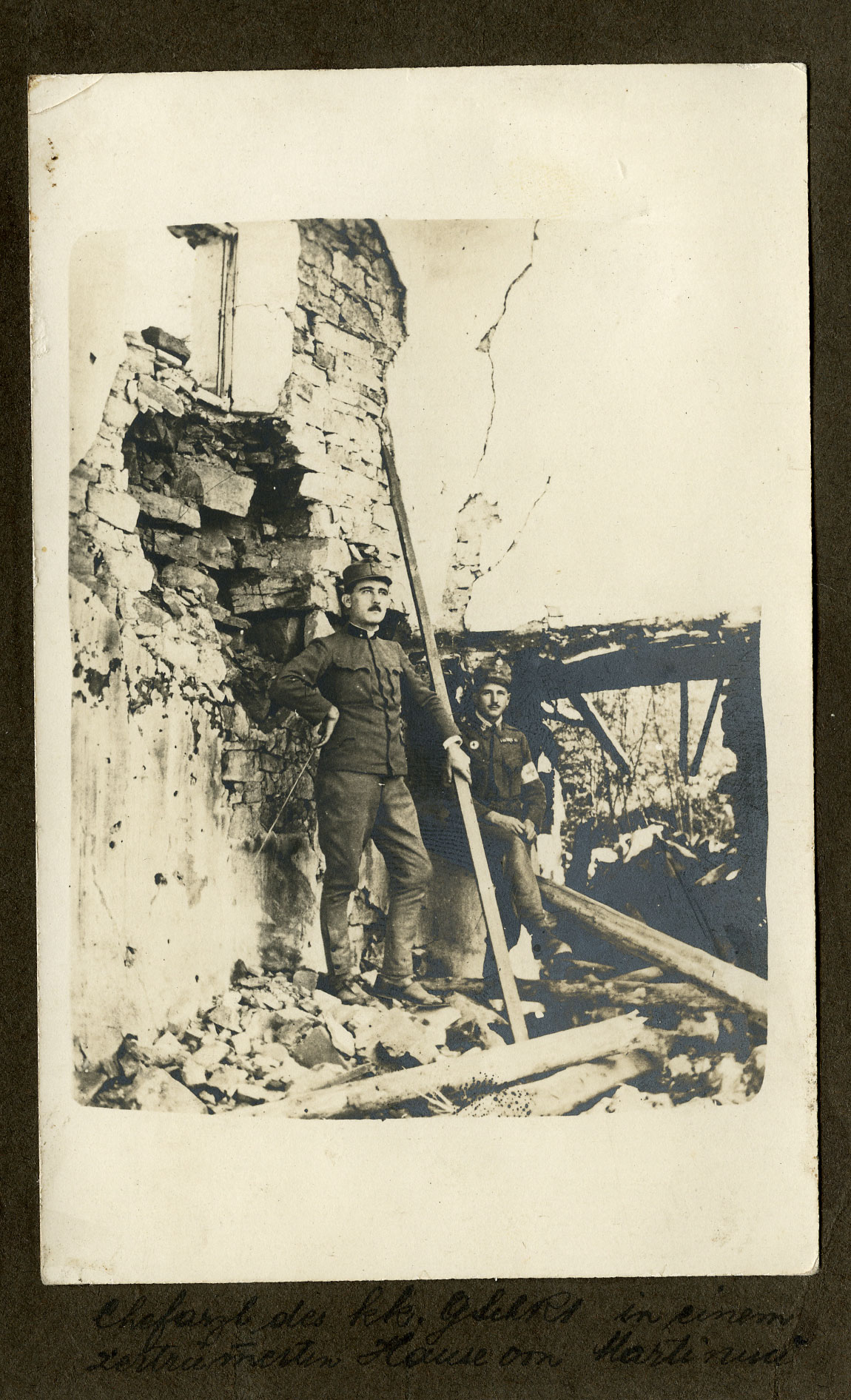 Primario dell'imperial regio 1° Reggimento dei Fucilieri di Montagna davanti ad una casa distrutta di Martinucci