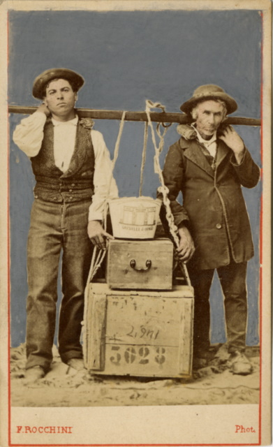 Tra le casse che i due facchini stanno portando vi e' una cappelliera con l'iscriizone della manifattura: Gresielle & Irmao