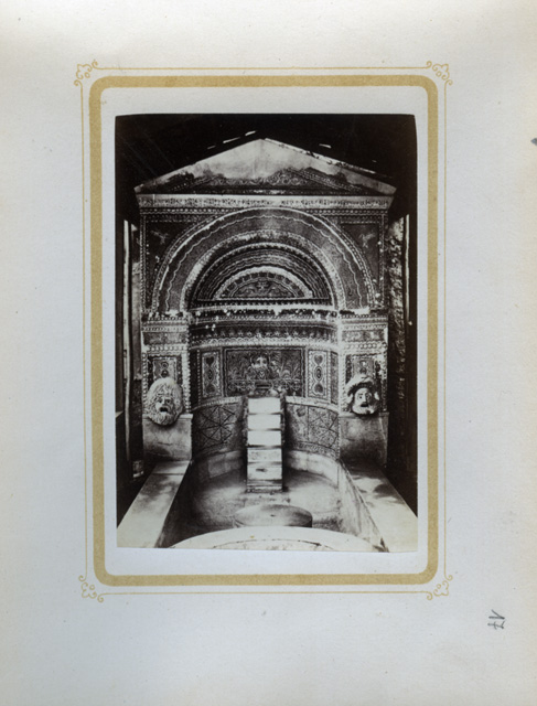 Casa della Fontana Grande, dimora pompeiana posta sulla via di Mercurio, caratterizzata da una monumentale fontana mosaicata che le dà il nome. La grande fontana a ninfeo collocata sulla parete di fondo del piccolo giardino, al di là dell'atrio, sormontata da un piccolo frontone è interamente rivestita da un mosaico realizzato con paste vitree policrome, tessere di calcare, gusci di molluschi bivalve (dette murex), sferette dal vivido blu egiziano, concrezioni calcaree con tracce di cromia rossa. La decorazione si completa con i due grandi mascheroni in marmo bianco di Luni, con evidenti le tracce di coloritura rossa; e ancora tre maschere tragiche sporgenti dagli stipiti della nicchia e una statuetta bronzea (copia) di un amorino con delfino posto su un basamento circolare all'interno della vasca. Degna di rilievo è anche la facciata esterna di questa casa, realizzata a bugnato in opera quadrata di tufo. Testo tratto da http://pompeiisites.org/comunicati/festa-e-notte-dei-musei-a-pompei/